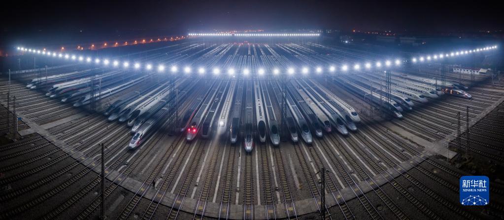 動(dòng)車(chē)組列車(chē)??吭谖錆h動(dòng)車(chē)段的存車(chē)線(xiàn)上(1月7日攝,無(wú)人機拼接照片)。新華社記者 伍志尊 攝