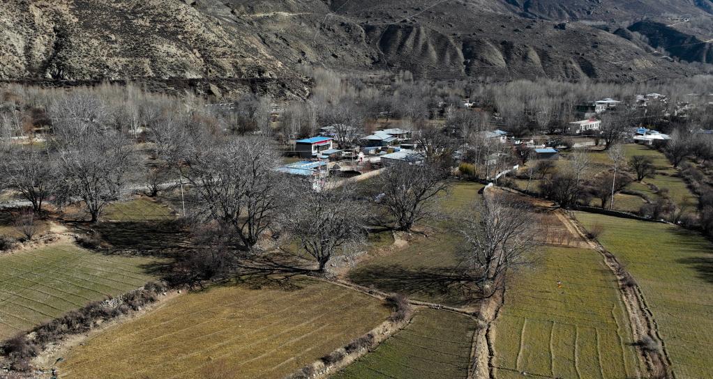 核桃樹(shù)環(huán)抱的山南市加查縣拉崗村(2月1日攝 無(wú)人機照片)。新華社記者晉美多吉 攝