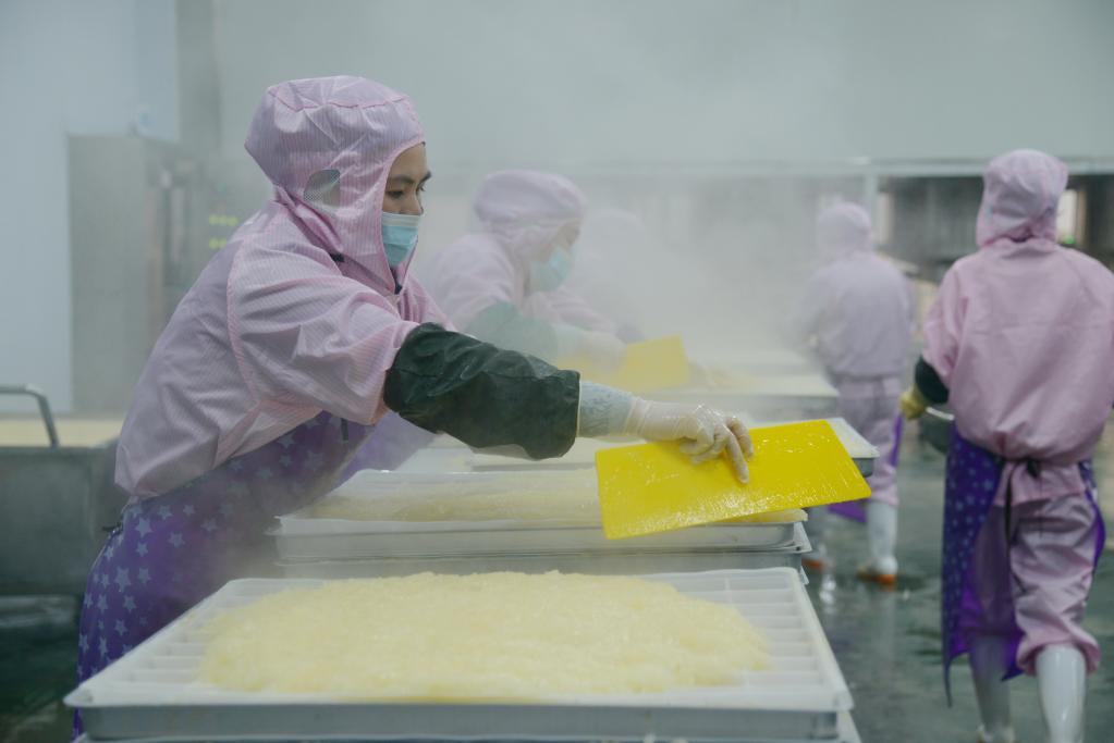 凍干銀耳羹生產(chǎn)車(chē)間里的工人們正將熬制完成的銀耳羹裝入模具。新華社記者李昊澤 攝