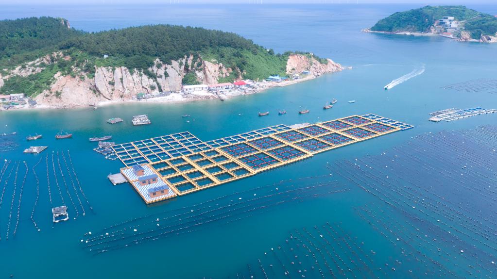 在黃海深處的大連市長(cháng)??h,馬達聲中,漁民駕著(zhù)小船,帶著(zhù)記者駛向深海。黛藍色的海面上,浮筏和網(wǎng)箱一字排開(kāi),看不到邊際。這些密布的網(wǎng)箱是當地海洋牧場(chǎng)中的智能化深海魚(yú)類(lèi)生態(tài)養殖網(wǎng)。