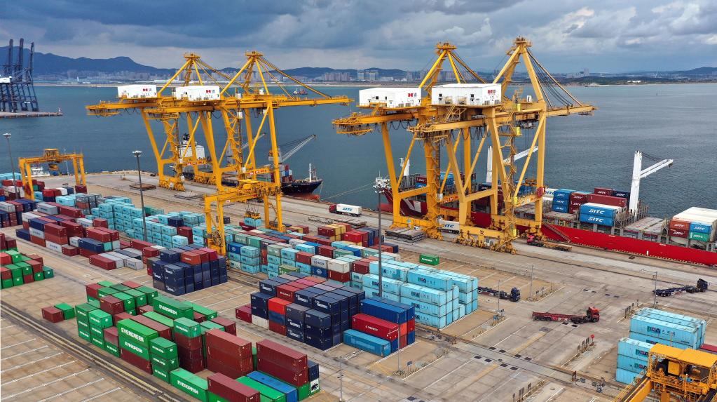 在遼寧省大連市遼寧港口集團大連港集裝箱碼頭,貨輪在裝卸集裝箱。新華社記者姚劍鋒 攝