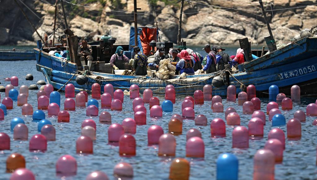 大連市長(cháng)??h海洋島鎮的漁民在海洋牧場(chǎng)上作業(yè)。新華社記者姚劍鋒 攝