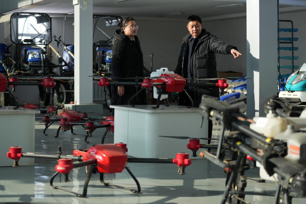 2月14日,孫斌(右)在黑龍江省樺南縣鴻源水稻專(zhuān)業(yè)合作社的現代水田農機展示區介紹無(wú)人機使用情況。新華社記者王建威 攝
