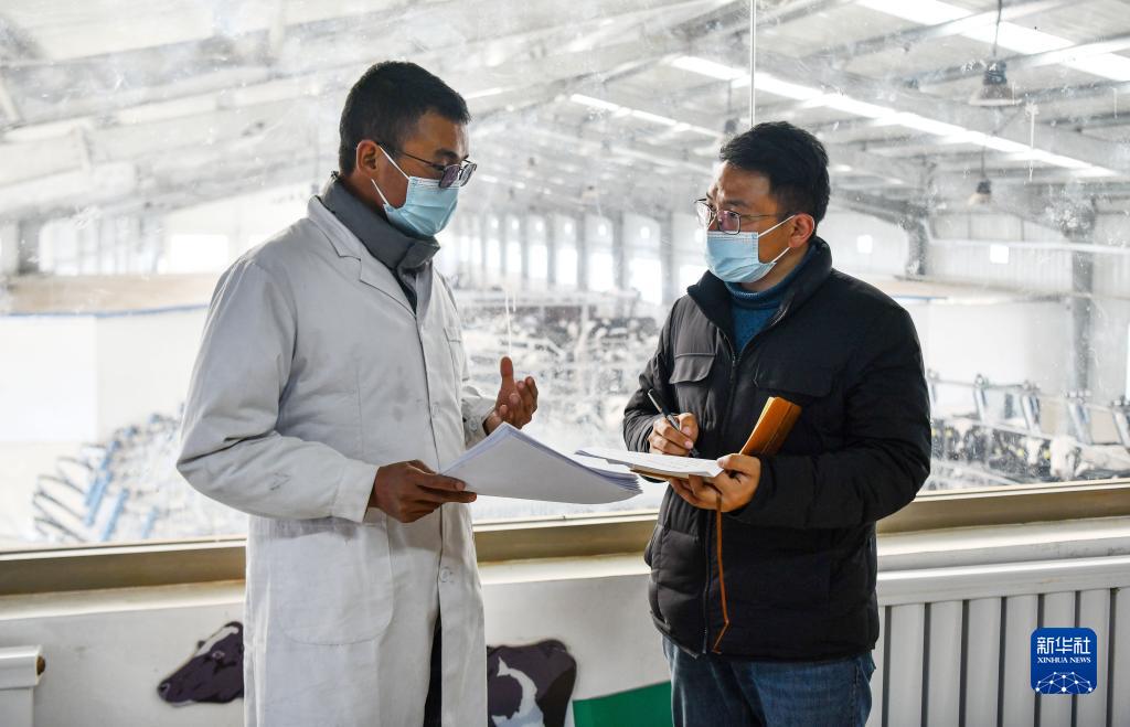 扎西江村(右)在隆子縣一家標準化奶牛養殖基地調研當地產(chǎn)業(yè)發(fā)展和帶動(dòng)群眾增收情況(2月14日攝)。新華社記者 晉美多吉 攝