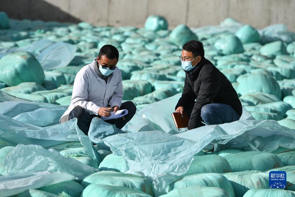 扎西江村(右)在隆子縣一家標準化奶牛養殖基地查看牛飼料,調研當地產(chǎn)業(yè)發(fā)展情況(2月14日攝)。新華社記者 晉美多吉 攝