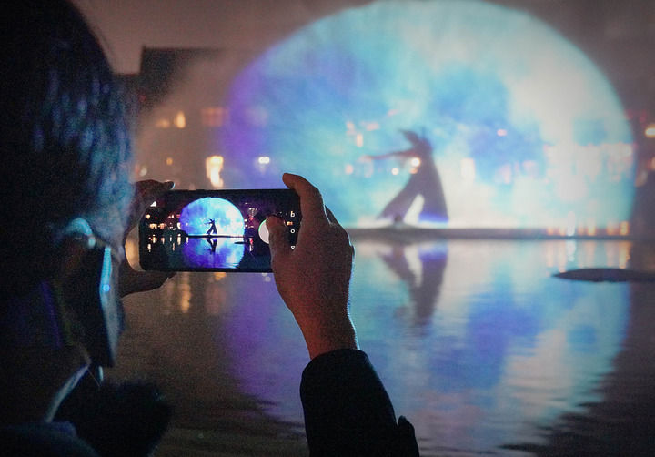 游客在洛陽(yáng)市洛邑古城內觀(guān)看水幕電影(2月22日攝)。新華社記者 李安 攝
