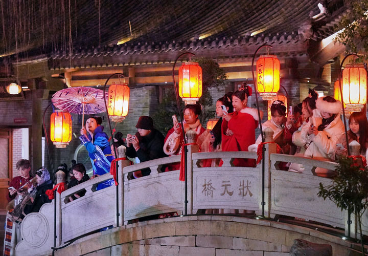 游客在洛陽(yáng)市洛邑古城內游玩拍照(2月22日攝)。新華社記者 李安 攝
