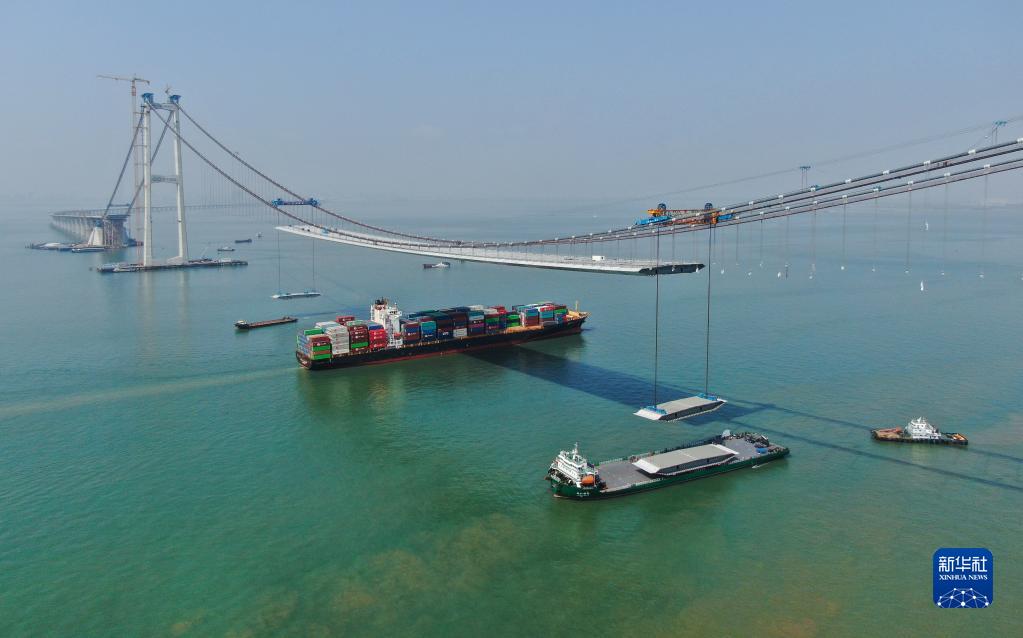 集裝箱貨輪通過(guò)正在吊裝鋼箱梁的深中通道伶仃洋大橋(2023年2月22日攝,無(wú)人機照片)。新華社記者 鄧華 攝