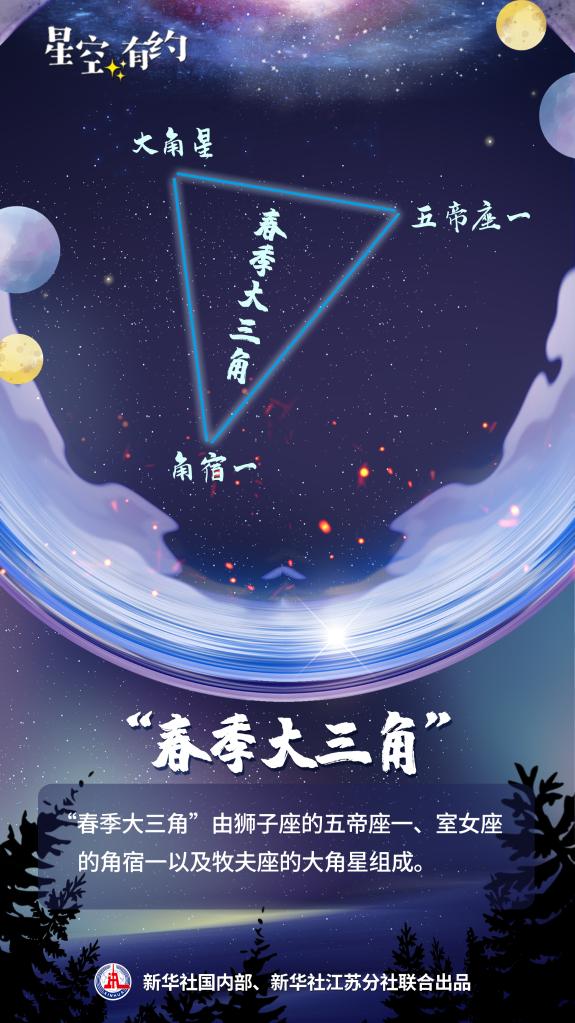 3月天黑后,“春季大三角”會(huì )從東方緩緩升起。其中,大角星是春夜星空的第一亮星,角宿一則是代表“二月二,龍抬頭”的一顆“龍頭星”。