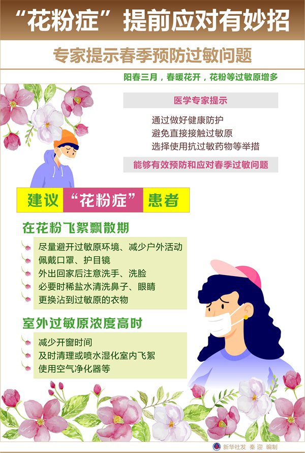 陽(yáng)春三月,春暖花開(kāi)。隨著(zhù)春季到來(lái),花粉等過(guò)敏原增多,可能給過(guò)敏性體質(zhì)人群的出行和生活帶來(lái)不便。醫學(xué)專(zhuān)家提示,通過(guò)做好健康防護,避免直接接觸過(guò)敏原,選擇使用抗過(guò)敏藥物等舉措,能夠有效預防和應對春季過(guò)敏問(wèn)題。