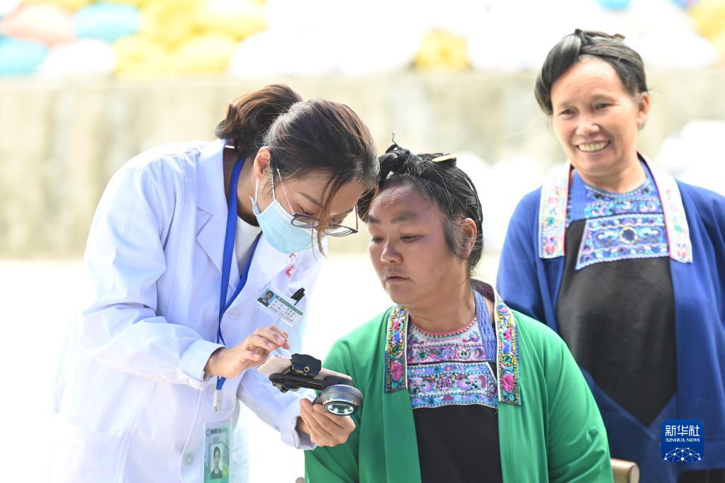 在廣西融水苗族自治縣白云鄉幫陽(yáng)村,來(lái)自廣東醫科大學(xué)附屬醫院的李芳谷博士(左)在“送醫進(jìn)苗寨”活動(dòng)上給村民提供醫療服務(wù)(2022年10月26日攝)。新華社記者 黃孝邦 攝