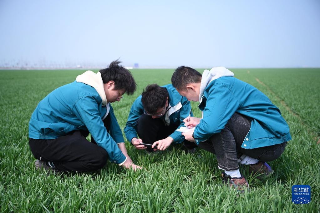 在河南省駐馬店市西平縣老王坡高標準農田示范區,臺曉林(左)、王仲琦和王英凡(右)一起查看苗情并做記錄(2023年2月28日攝)。新華社記者 張浩然 攝