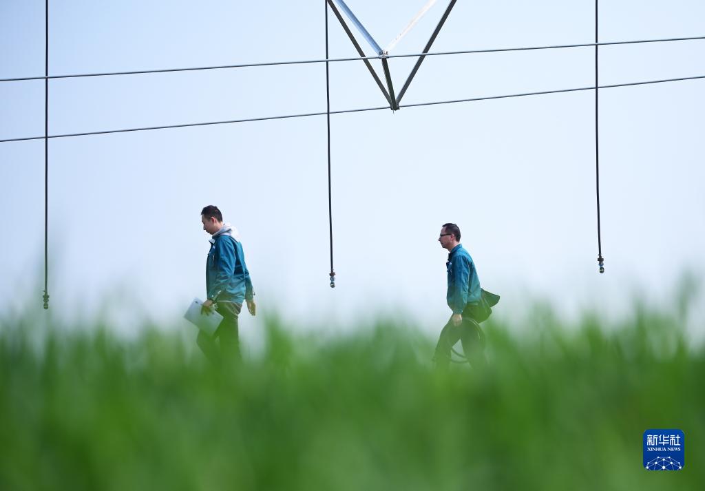 在河南省駐馬店市西平縣老王坡高標準農田示范區,劉亞輝(右)和王英凡在對平移式水肥一體化噴灌機進(jìn)行巡檢(2023年2月28日攝)。新華社記者 張浩然 攝