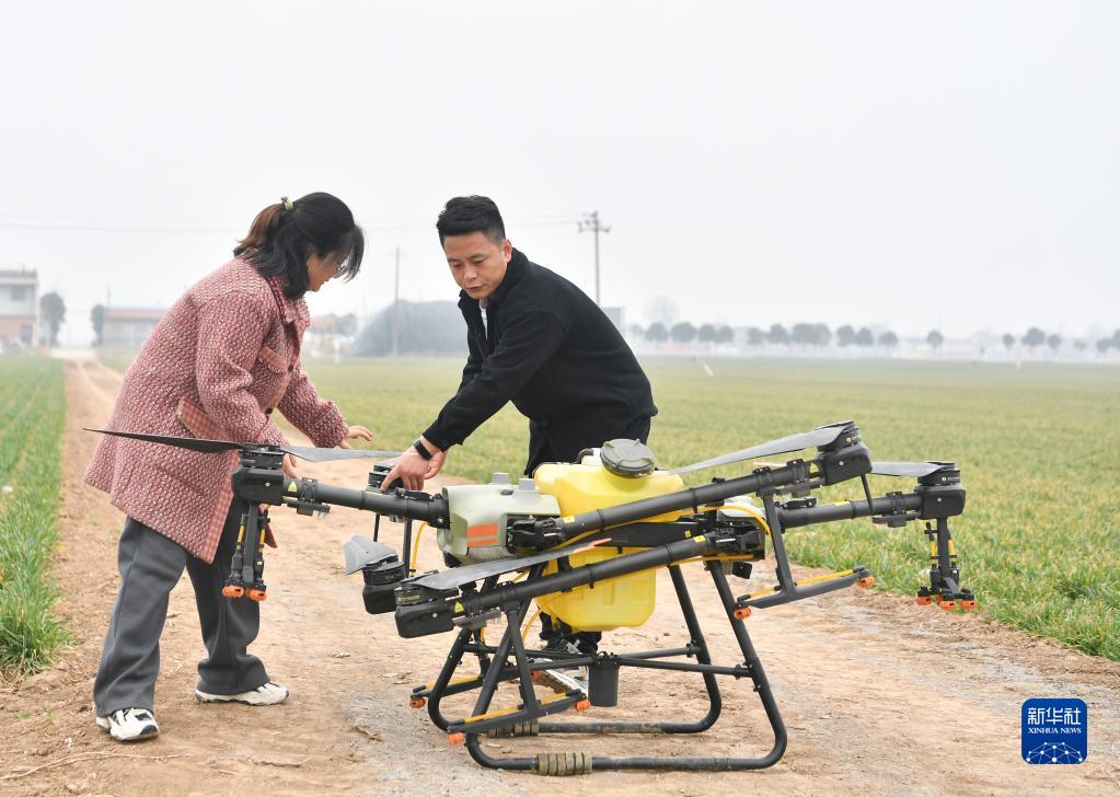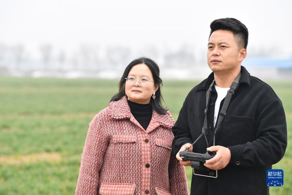 在陜西省寶雞市陳倉區慕儀鎮齊西村的農田,齊葉葉與齊昆(右)操控植保無(wú)人機管護作物(2023年2月27日攝)。新華社記者 張博文 攝