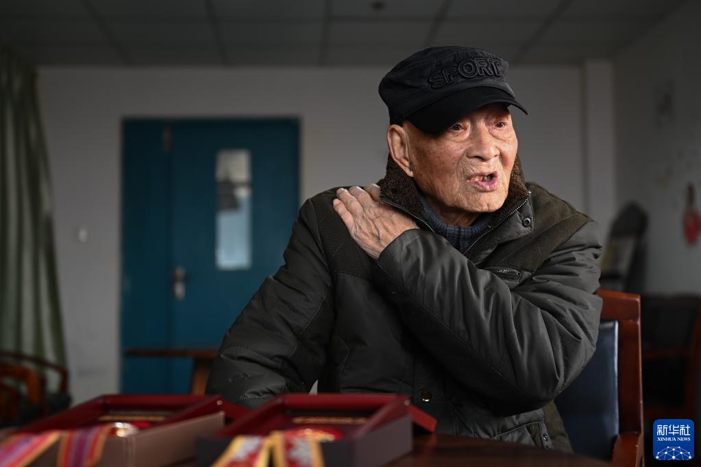 羅錦文老人在浙江省平湖市一家老年康復護理院接受記者采訪(fǎng),摸著(zhù)右側肩膀里子彈的位置(3月2日攝)。新華社記者 黃宗治 攝