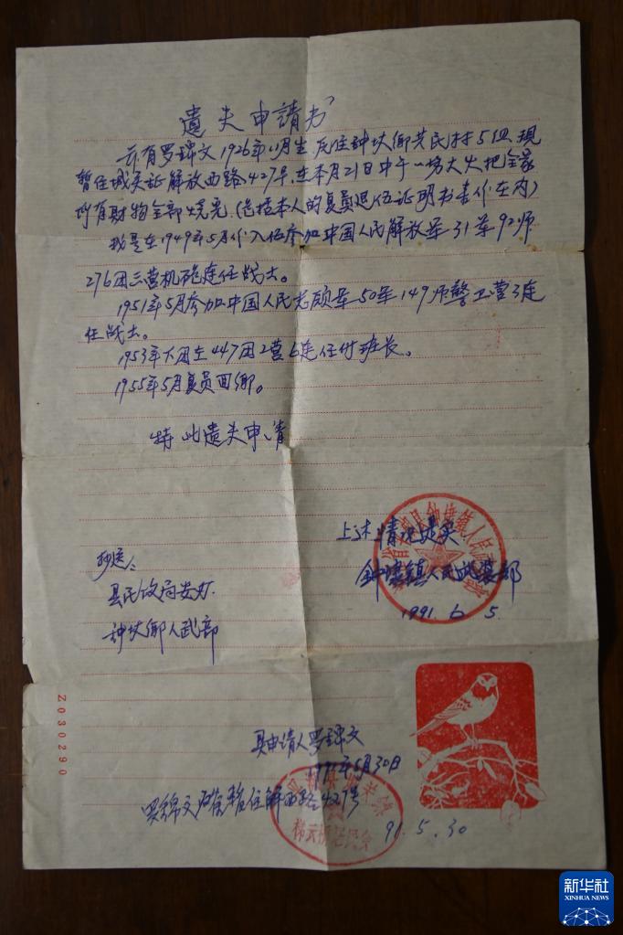 羅錦文于1991年提交的“遺失申請書(shū)”(3月2日攝)。作為老復員軍人,羅錦文這輩子唯一一次向政府“提要求”,是因為一場(chǎng)火災。結束務(wù)農回城后,1991年出租房里的一場(chǎng)火災把他“壓箱底”的一枚三等功獎?wù)录巴宋樽C明材料等全部燒毀。于是他向當時(shí)戶(hù)口所在地的鐘埭鎮人武部鄭重提交了一份“遺失申請書(shū)”,獲得了蓋章認定。新華社記者 黃宗治 攝