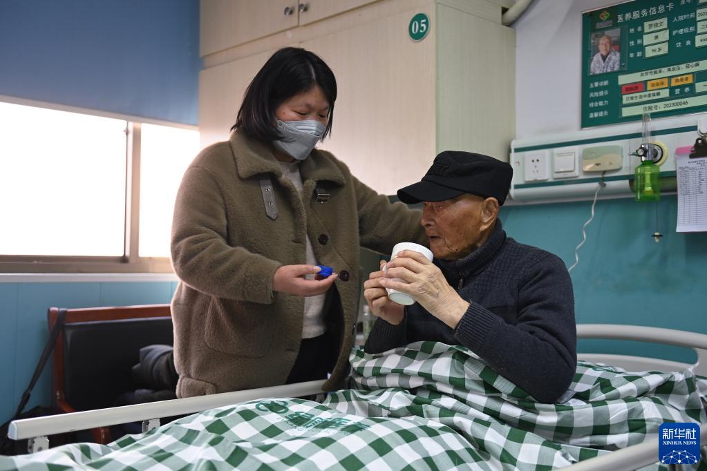 羅錦文兒媳柳燕(左)在浙江省平湖市一家老年康復護理院照顧羅錦文老人(3月2日攝)。新華社記者 黃宗治 攝
