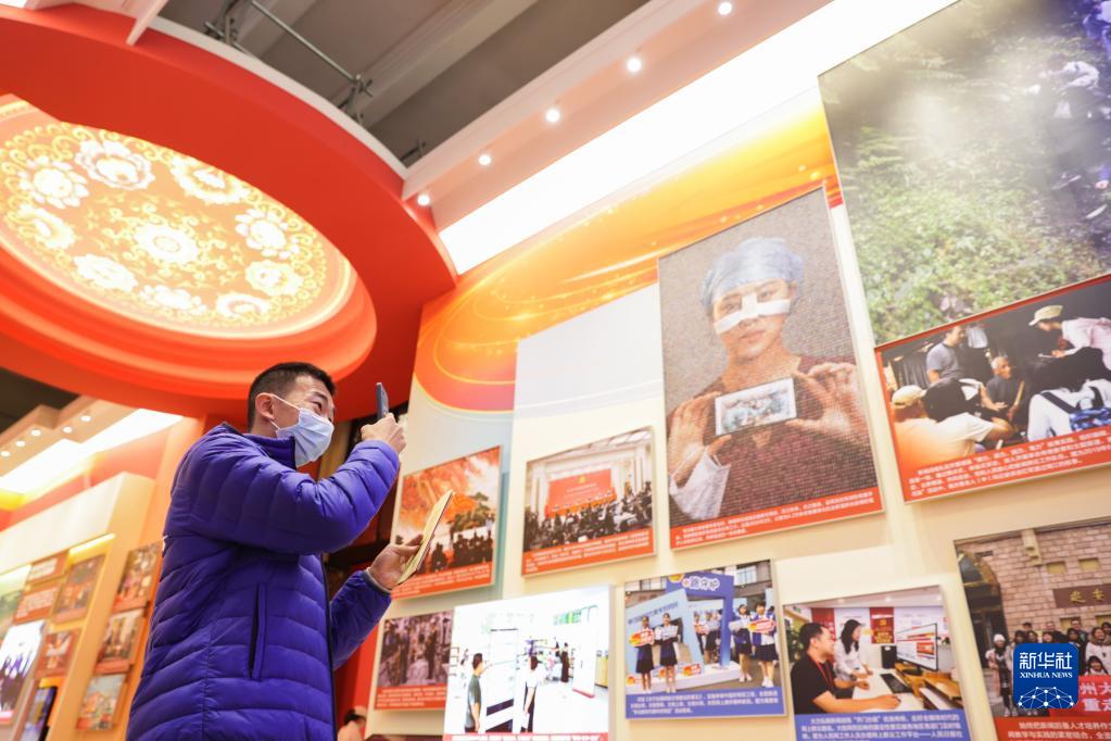 觀(guān)眾在“奮進(jìn)新時(shí)代”主題成就展第五單元“堅定文化自信 建設社會(huì )主義文化強國”展廳內參觀(guān)(2022年10月10日攝)。新華社記者 張玉薇 攝