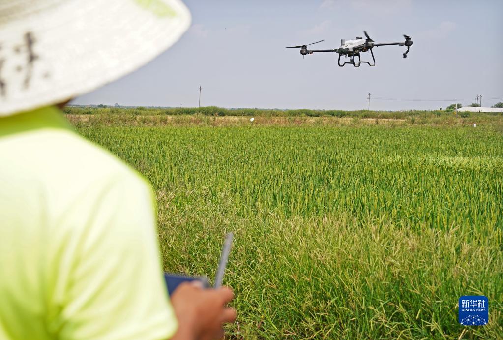 在位于江西省南昌縣蔣巷鎮的大田農社,農民正在操控無(wú)人機為稻田施肥(2022年9月16日攝)。 新華社記者 萬(wàn)象 攝