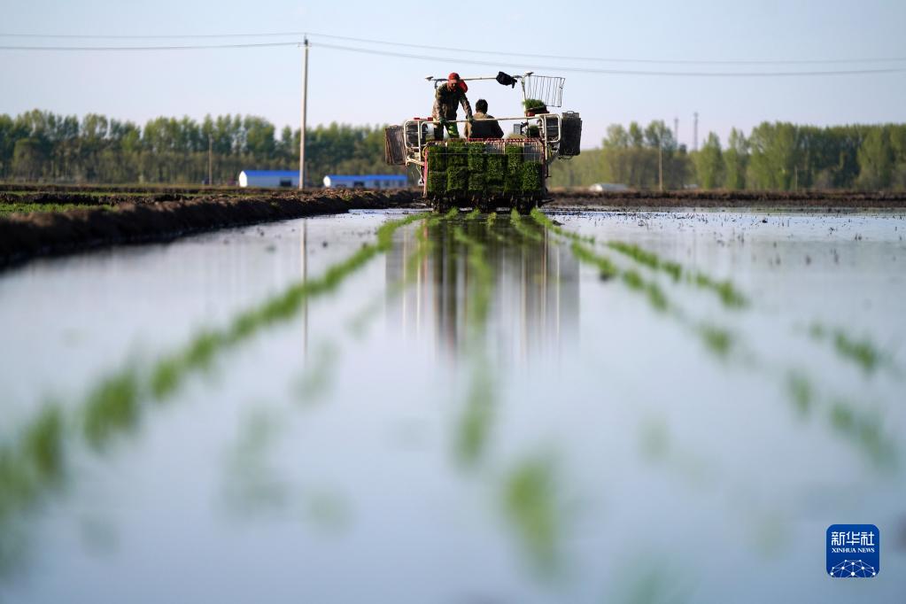 在北大荒集團建三江分公司七星農場(chǎng)有限公司的稻田中,種植戶(hù)在進(jìn)行插秧作業(yè)(2022年5月18日攝)。 新華社記者 王建威 攝