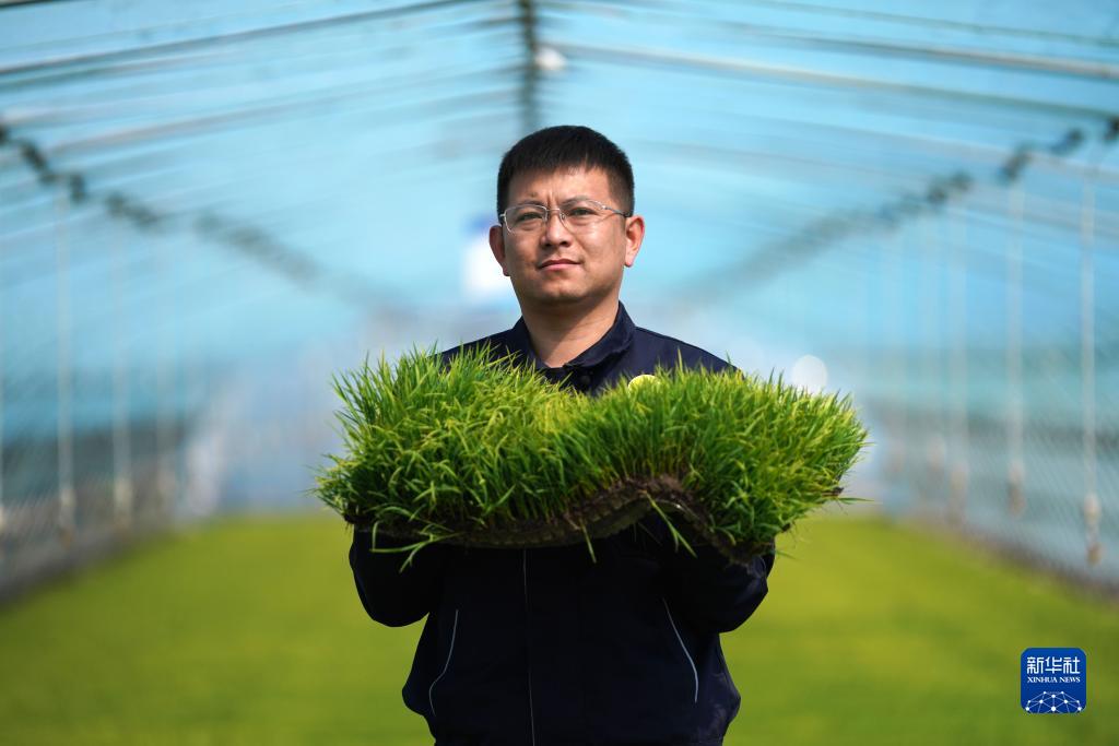 北大荒集團建三江分公司七星農場(chǎng)有限公司種植戶(hù)陸向導手捧水稻秧苗(2022年5月18日攝)。 新華社記者 王建威 攝