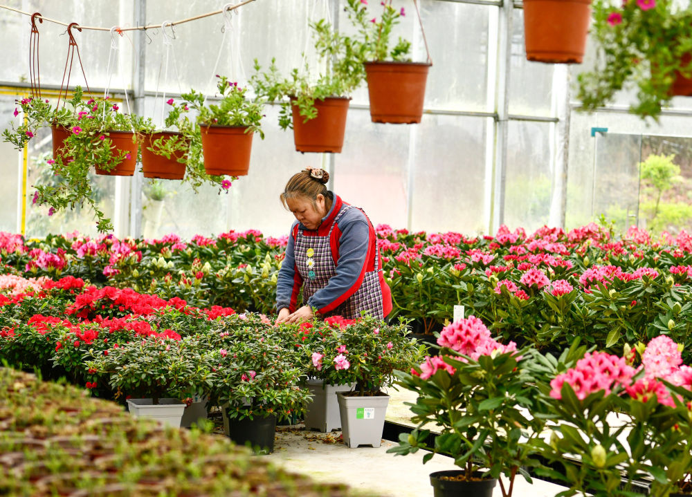 農民在貴州省畢節市百里杜鵑管理區匯境花卉基地管護花卉(2023年3月28日攝)。新華社記者 楊文斌 攝