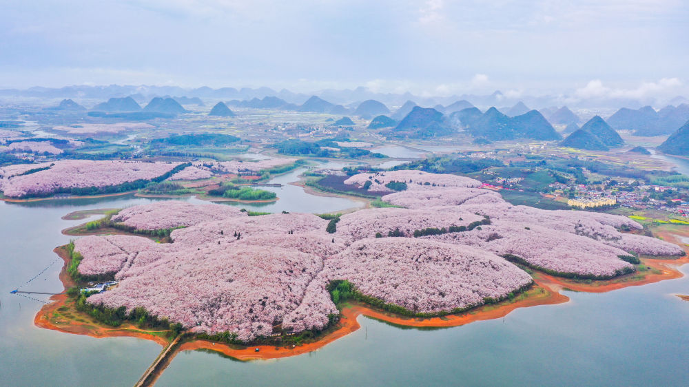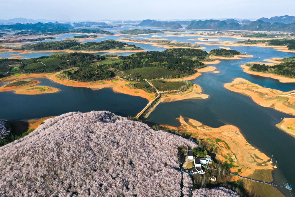 貴州省貴安新區櫻花園(無(wú)人機照片,2022年3月17日攝)。新華社記者 歐東衢 攝