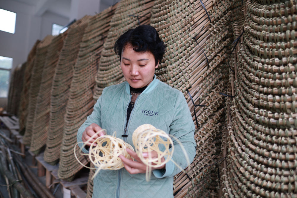 在貴州省赤水市竹城竹業(yè)加工坊,赤水竹編傳承人唐小容在編織竹制品(2022年11月29日攝)。新華社記者 劉續 攝