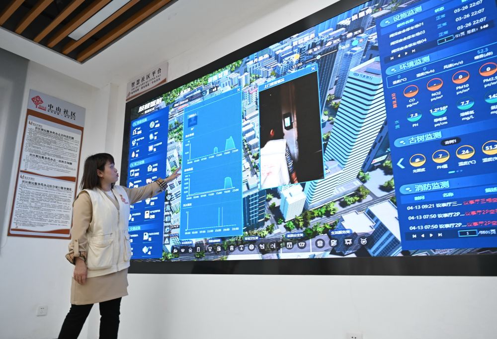 福州市鼓樓區是國家智能社會(huì )治理綜合實(shí)驗基地,社區工作者林英在鼓樓區鼓東街道中山社區介紹“智慧社區”建設提升基層治理能力情況(4月25日攝)。新華社記者 林善傳 攝