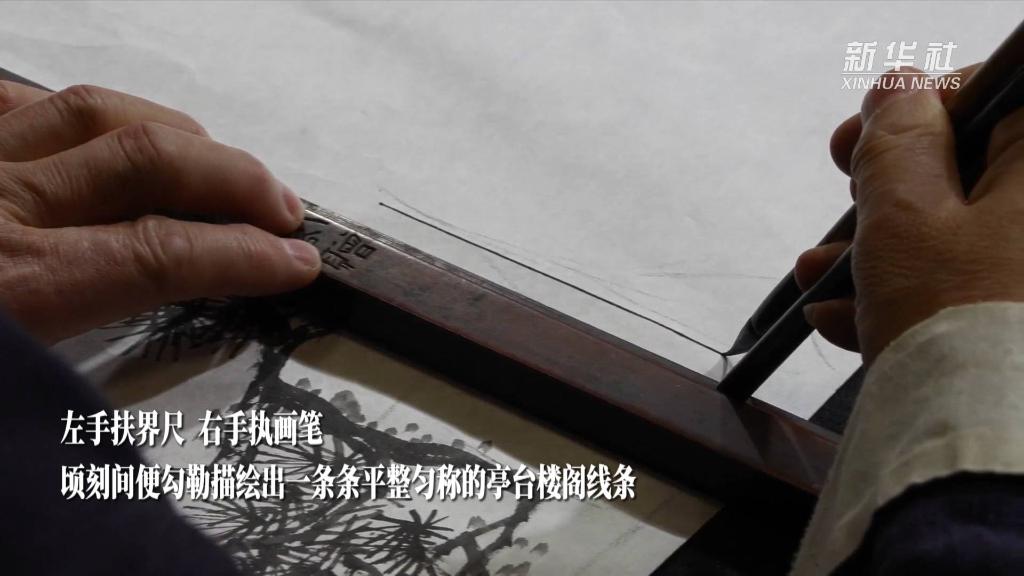 左手扶界尺,右手執畫(huà)筆,頃刻間便勾勒描繪出一條條平整勻稱(chēng)的亭臺樓閣線(xiàn)條。在江西南昌八大山人紀念館附近的一間工作室內,專(zhuān)研界畫(huà)40余年的高級畫(huà)師游新民正在創(chuàng )作之中。