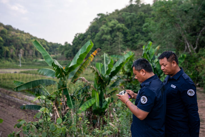 亞洲象監測員彭金福(左)和普永兵在云南省西雙版納州景洪市大渡崗鄉大荒壩村使用無(wú)人機監測象群(5月11日攝)。新華社記者 胡超 攝