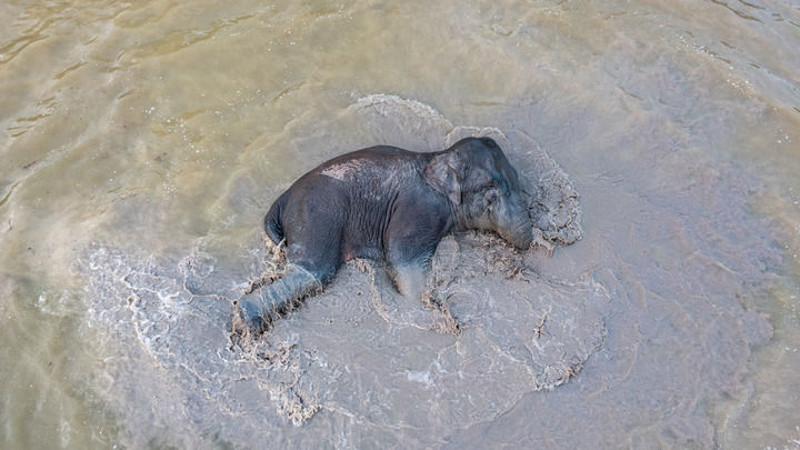 一頭野象在云南省西雙版納州景洪市大渡崗鄉大荒壩村一處魚(yú)塘里“洗澡”(5月9日攝,無(wú)人機照片)。新華社記者 胡超 攝