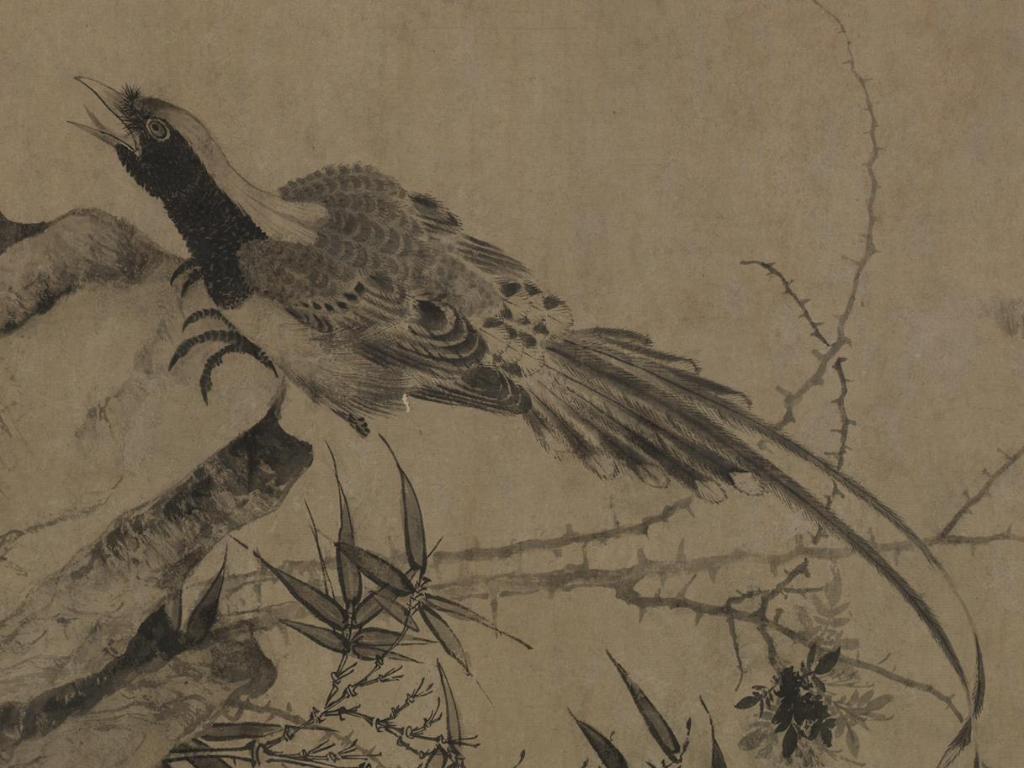 此畫(huà)最吸引人的是圖中禽鳥(niǎo)的畫(huà)法。在中國傳統繪畫(huà)中,大多數畫(huà)家在描繪禽鳥(niǎo)的時(shí)候都會(huì )使用絢麗的色彩,以便突出禽鳥(niǎo)身上的羽毛,但在這幅作品上,邊魯僅用墨色就取代了那些豐富的色彩。他以墨色的濃淡深淺、干濕相宜的變化和適度留白將禽鳥(niǎo)五彩斑斕的羽毛表現得淋漓盡致。