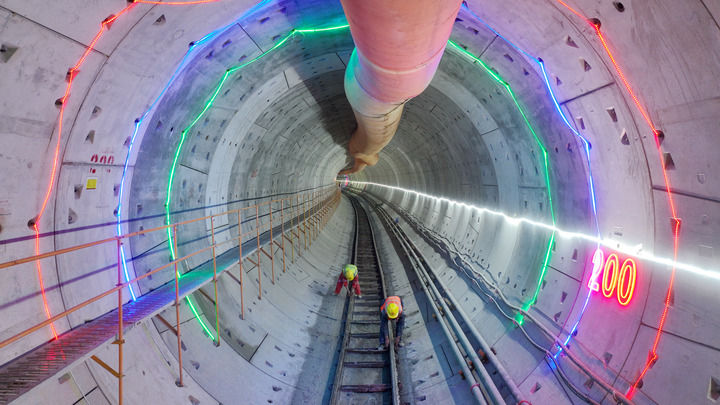 浙江省湖州市德清縣杭德市域鐵路建設現場(chǎng),中國中鐵股份有限公司的工人在隧道內施工作業(yè)(2023年4月15日攝,無(wú)人機照片)。新華社發(fā)(謝尚國攝)