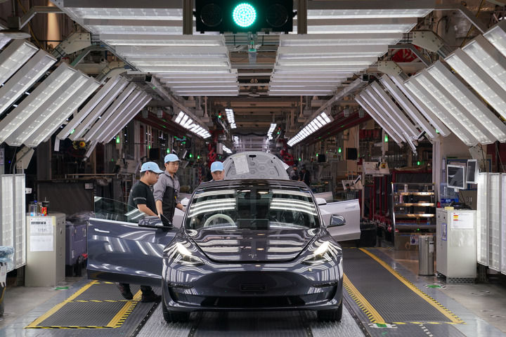 工作人員在特斯拉上海超級工廠(chǎng)總裝車(chē)間生產(chǎn)線(xiàn)上作業(yè)(2023年5月12日攝)。新華社記者 馬寧 攝