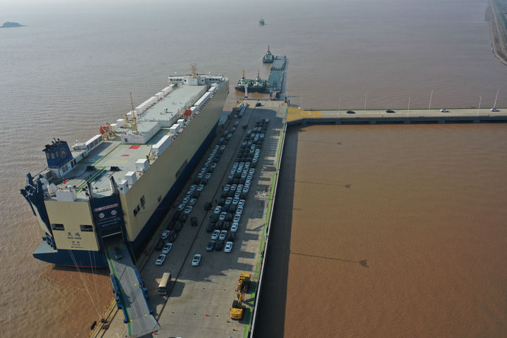 一艘滾裝船??吭谡憬瓕幉ㄖ凵礁勖窎|碼頭,裝運的汽車(chē)從船內駛出(2022年12月13日攝,無(wú)人機照片)。新華社記者 黃宗治 攝