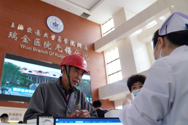 在位于江蘇省無(wú)錫市的上海交通大學(xué)醫學(xué)院附屬瑞金醫院無(wú)錫分院,就診者在服務(wù)臺咨詢(xún)(5月18日攝)。新華社記者 馬寧 攝