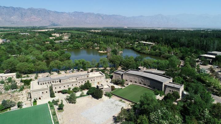 位于賀蘭山東麓的志輝源石酒莊(6月8日攝,無(wú)人機照片)。新華社記者 王鵬 攝
