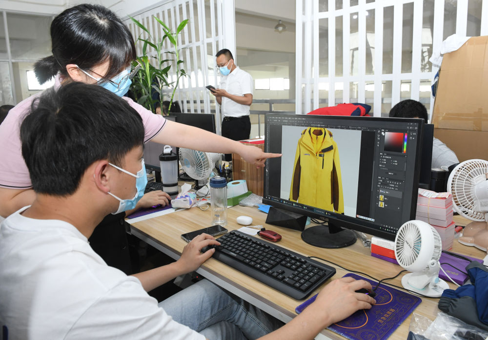 在浙江省臺州市三門(mén)縣的一家戶(hù)外用品企業(yè),工作人員在討論一款沖鋒衣的設計(2022年6月14日攝)。新華社記者 翁忻旸 攝
