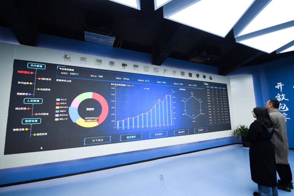 浙江省湖州市長(cháng)興縣呂山鄉湖羊智慧循環(huán)產(chǎn)業(yè)園里的數字大屏實(shí)時(shí)顯示湖羊的各類(lèi)監控數據(2022年1月6日攝)。新華社記者 徐昱 攝