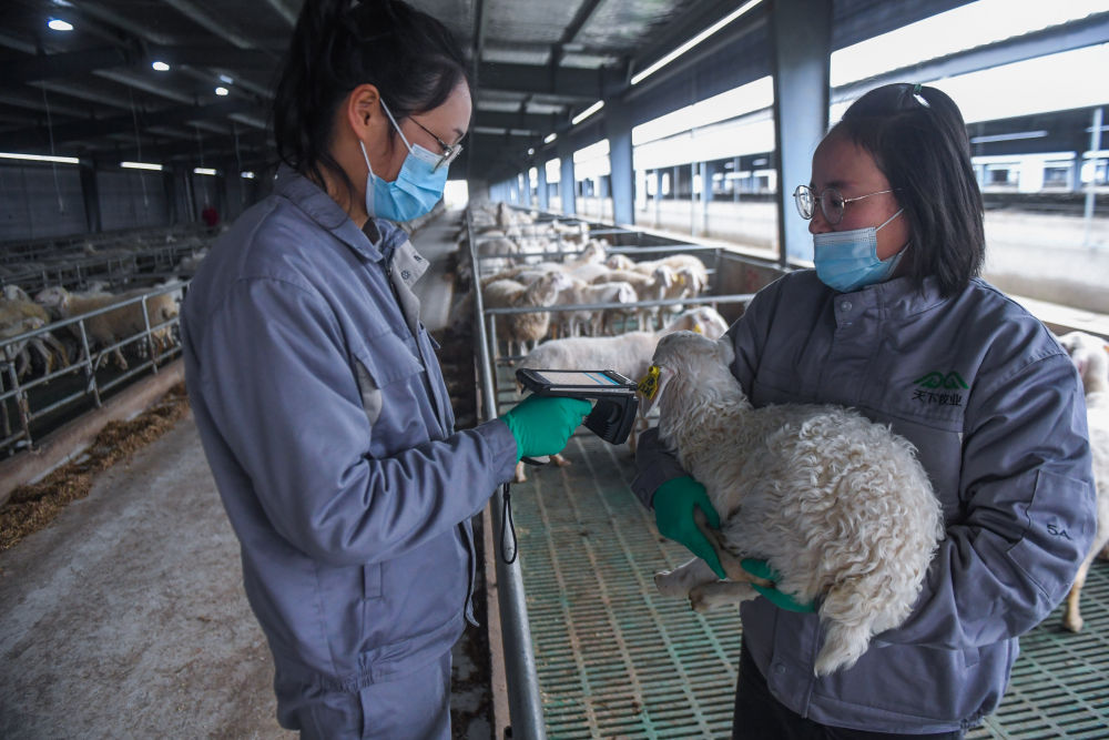浙江省湖州市長(cháng)興縣呂山鄉湖羊智慧循環(huán)產(chǎn)業(yè)園的工作人員在掃描湖羊幼仔耳朵上的數字芯片(2022年1月6日攝)。新華社記者 徐昱 攝