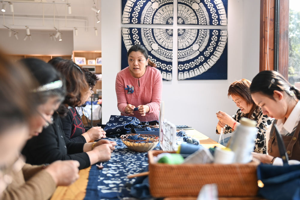 在奉化區西塢街道雷山村“七彩巧婦”共富工坊,寧波市非物質(zhì)文化遺產(chǎn)藍印花布印染技藝代表性傳承人張劍峰(中)向村民演示手工飾品的制作方法(2023年3月8日攝)。新華社記者 黃宗治 攝