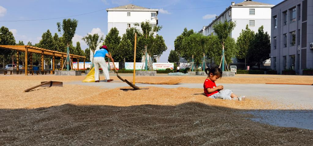 鄧海生帶著(zhù)小孫女在德州市陵城區新城社區黨群服務(wù)中心大院里晾曬小麥。(新華社記者葉婧 攝)