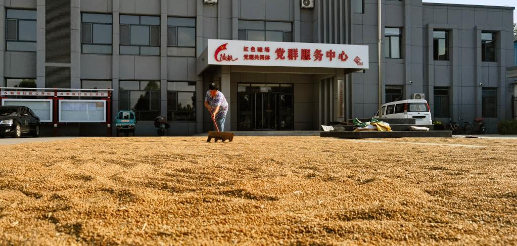 張秀梅正在德州市陵城區新城社區黨群服務(wù)中心大院里晾曬小麥。(新華社記者葉婧 攝)