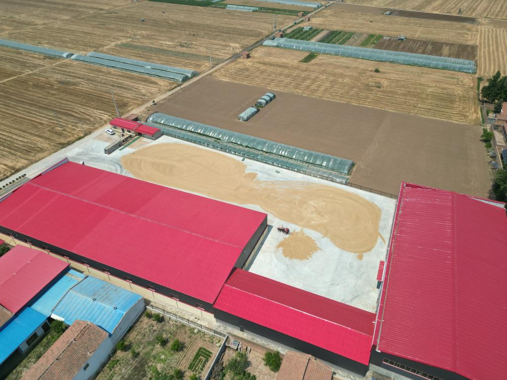 6月13日,農戶(hù)在德州市臨邑縣臨盤(pán)街道政府大院曬糧。(新華社記者徐速繪 攝)