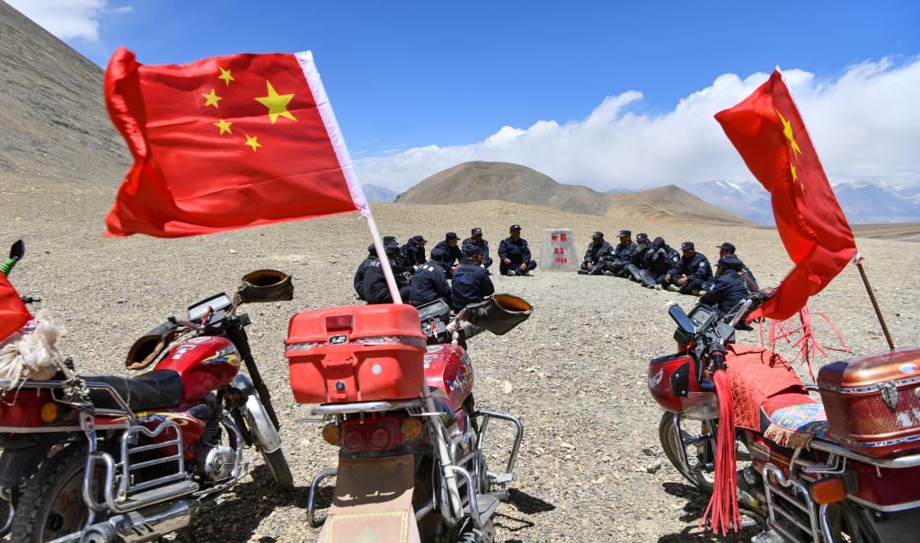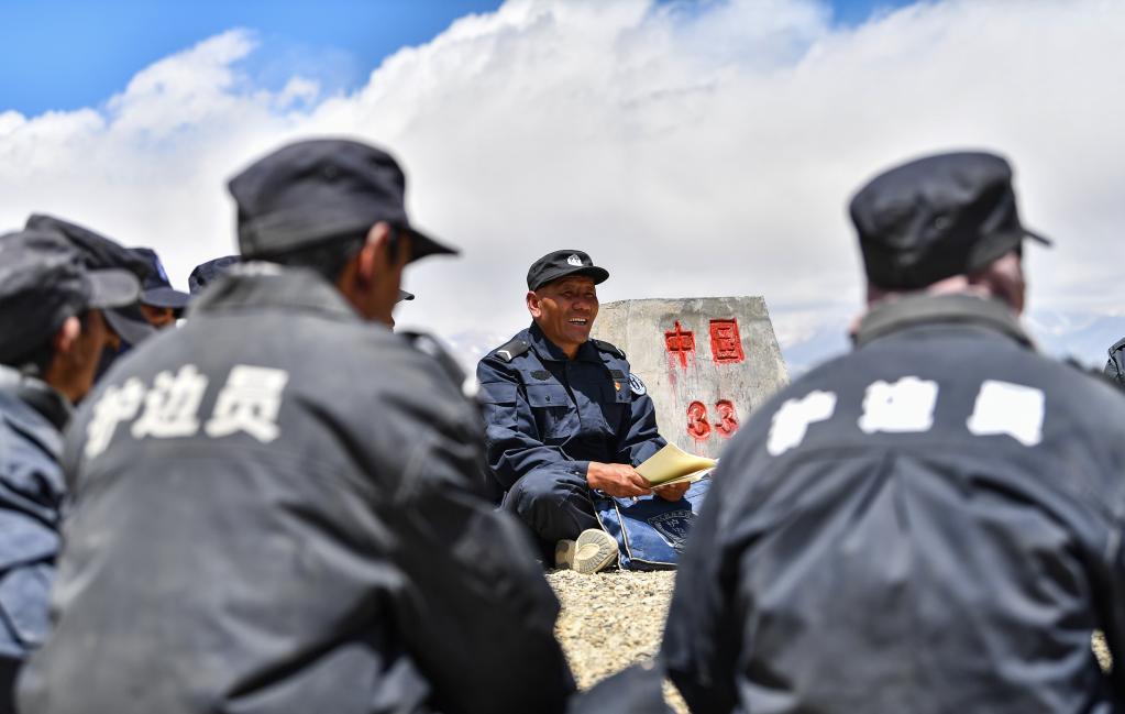 在33號界碑處,護邊隊在隊長(cháng)石角(右二)的帶領(lǐng)下開(kāi)展學(xué)習(6月2日攝)。新華社記者 晉美多吉 攝
