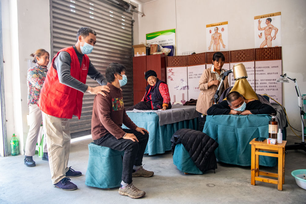 在重慶市綦江區安穩鎮崇河村由當地民政部門(mén)建立的普惠養老場(chǎng)所“自然健康屋”,志愿者為老人提供免費理療服務(wù)(2022年10月18日攝)。新華社記者 唐奕 攝
