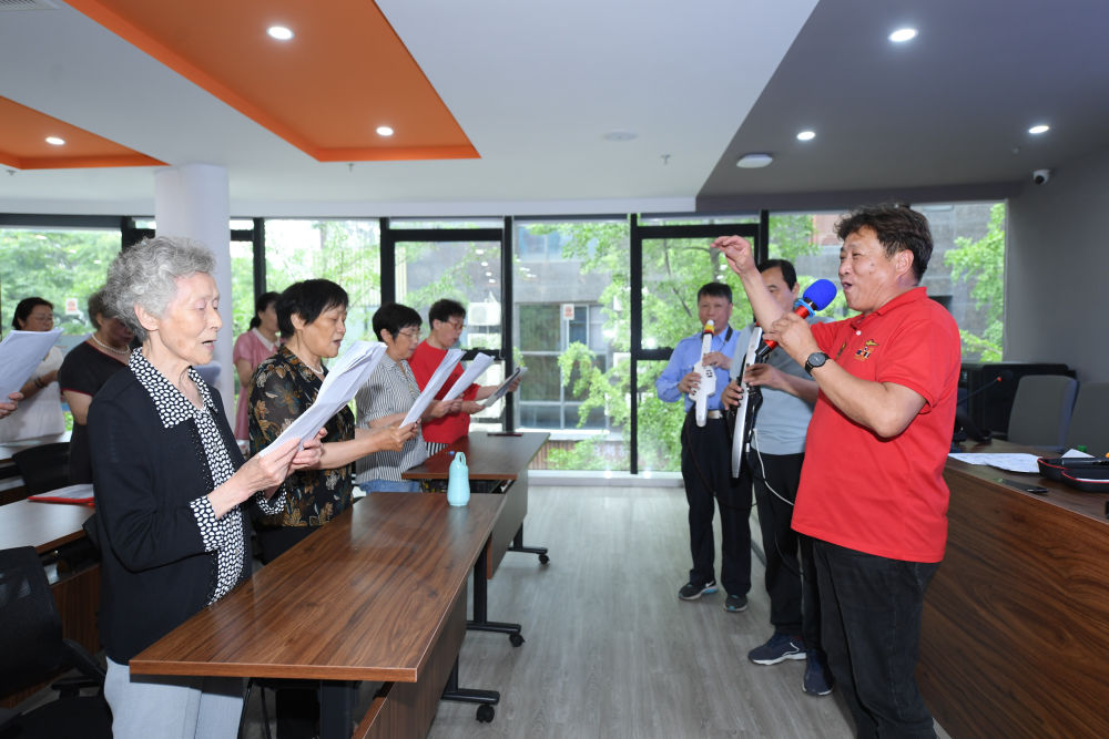 在浙江省湖州市愛(ài)山街道利民社區,一個(gè)公益組織的聲樂(lè )老師和樂(lè )手帶領(lǐng)老年居民開(kāi)展合唱活動(dòng)(2023年5月29日攝)。新華社記者 翁忻旸 攝