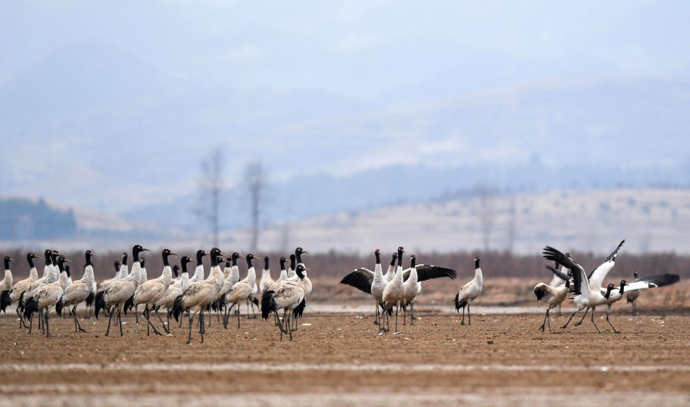 在貴州草海國家級自然保護區棲息的黑頸鶴(2023年2月9日攝)。新華社記者 楊文斌 攝