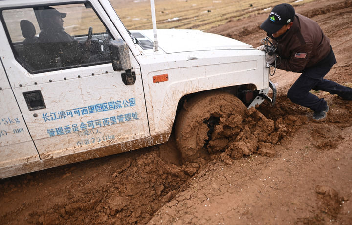 正值夏天,可可西里原本的凍土和沼澤融化成一個(gè)個(gè)爛泥灘。絞盤(pán)斷了、千斤頂壞了,巡山車(chē)輛埋在泥里,動(dòng)彈不得。